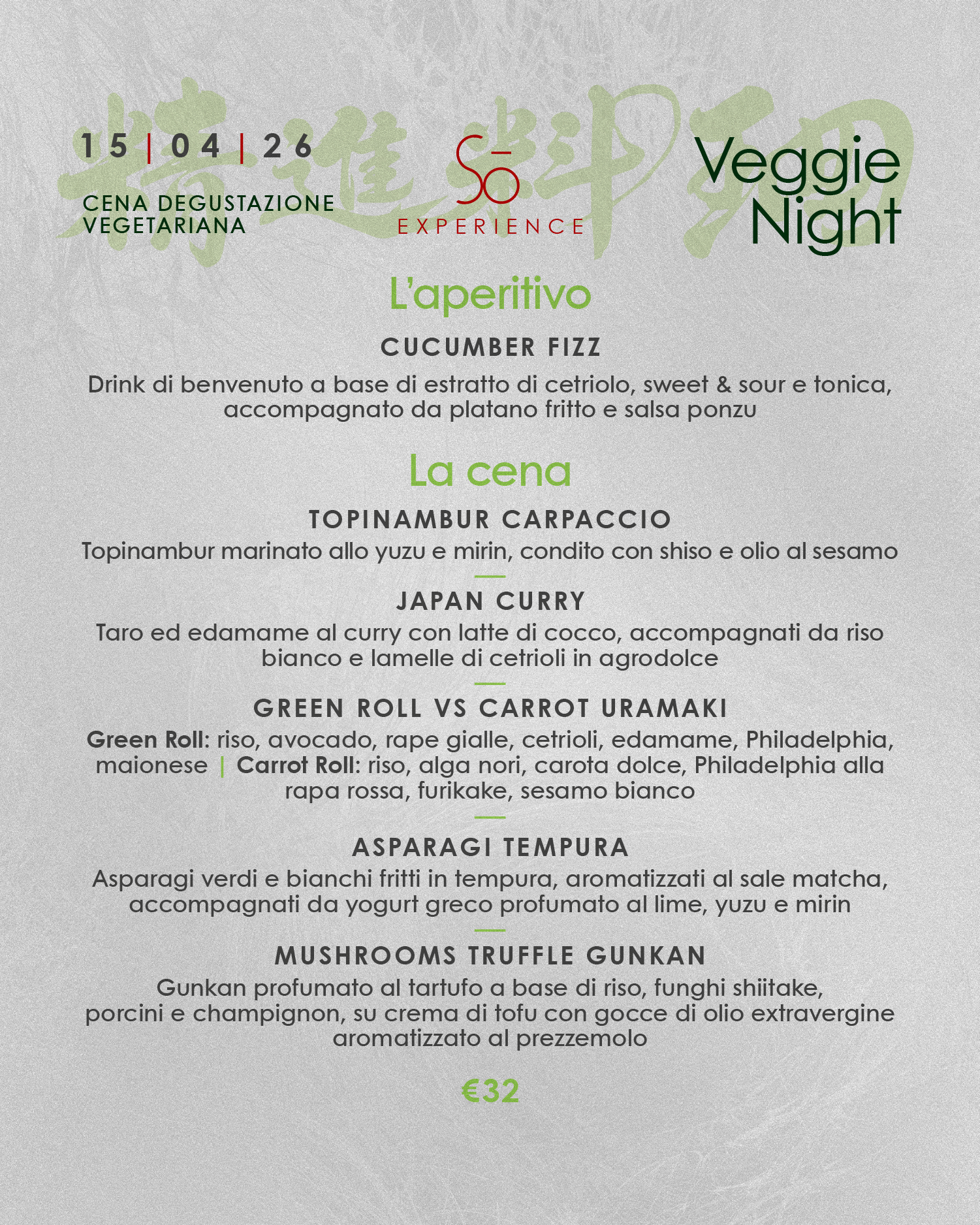 Una cena degustazione esclusiva dedicata alla cucina vegetariana, dove creatività e stagionalità incontrano la tipicità della cultura orientale.
